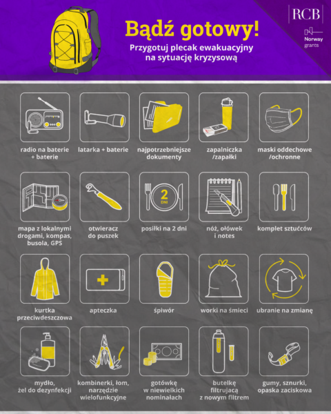 Co powinien zawierać plecak ewakuacyjny Pobierz grafikę: Plecak ewakuacyjny Plecak_ewakuacyjny.png 2.09MB Źródło: www.gov.pl Mariusz Gawlik2025-09-26T22:23:12+02:0026 września 2025|Aktualności, Ochrona ludności i obrona cywilna| Udostępnij FacebookXLinkedInWhatsAppEmail
