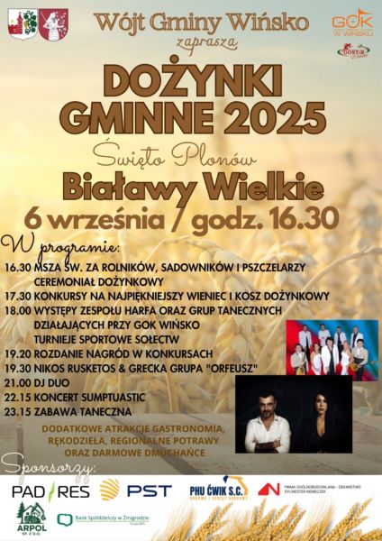 Już 6 września w Białawach Wielkich odbędą się Dożynki Gminne 2025. Rozpoczęcie uroczystości zaplanowano na godzinę 16:30.