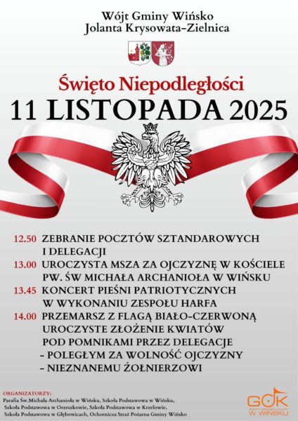 Wójt Gminy Wińsko Jolanta Krysowata-Zielnica zaprasza mieszkańców do wspólnego świętowania 107. rocznicy odzyskania przez Polskę niepodległości.