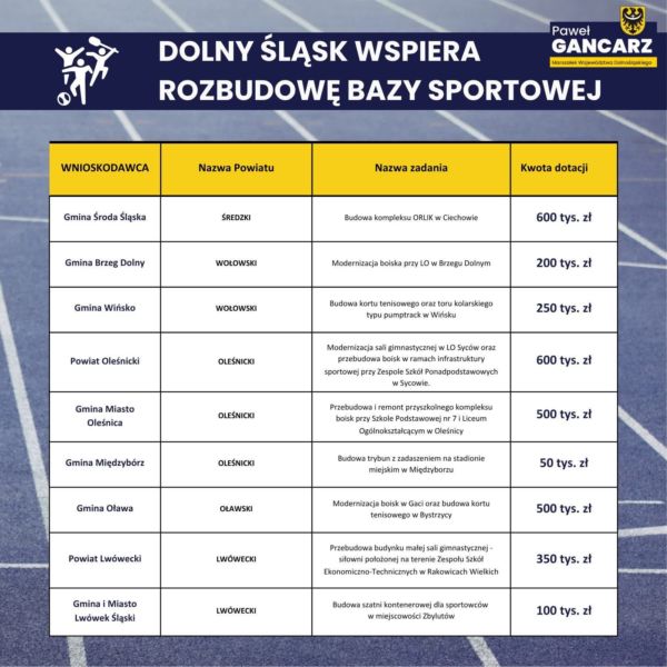 Wielkie podziękowania kierujemy do Pawła Gancarza – Marszałka Województwa Dolnośląskiego oraz wszystkich osób zaangażowanych w rozwój naszej sportowej przyszłości. Dzięki Wam Dolny Śląsk rośnie w siłę – nie tylko na mapie inwestycji, ale przede wszystkim w sercach mieszkańców.