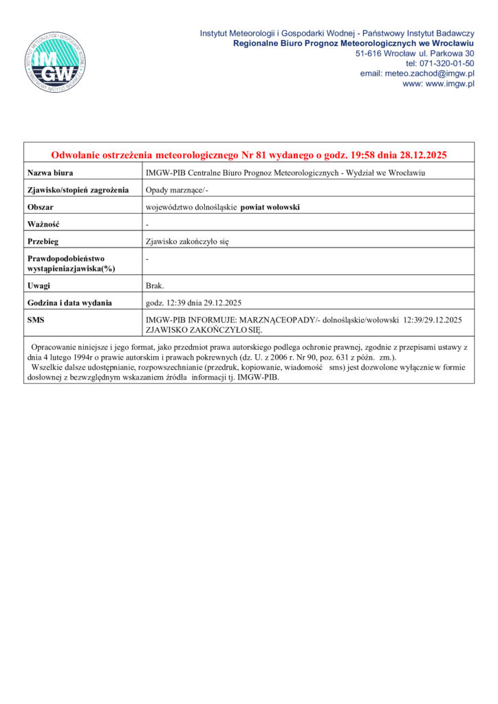 Obowiązujące ostrzeżenia meteorologiczne Angelika Domżał2025-12-29T15:15:54+01:0029 grudnia 2025|Ostrzeżenia meteorologiczne| Udostępnij FacebookXLinkedInWhatsAppEmail