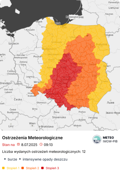Obszar obowiązujących ostrzeżeń meteorologicznych na terenie Polski na dzień 8 lipca 2025 r.: