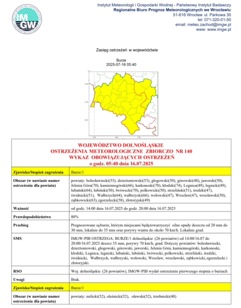 Ostrzeżenie meteorologiczne zbiorczo nr 140 na dzień 16.07.2025 r. Zjawisko/Stopień zagrożenia Burze/1 Mariusz Gawlik2025-07-16T11:03:10+02:0016 lipca 2025|Ostrzeżenia meteorologiczne| Udostępnij FacebookXLinkedInWhatsAppEmail