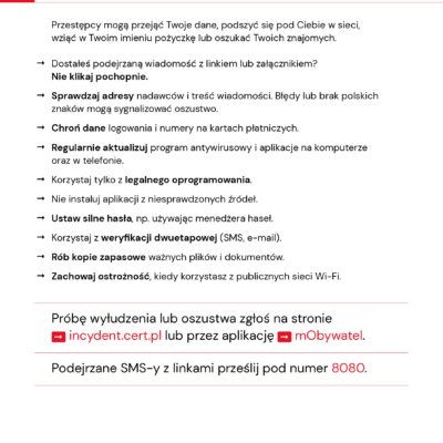 Próbę wyłudzenia lub oszustwa zgłoś na stronie incydent.cert.pl lub przez aplikację mObywatel.