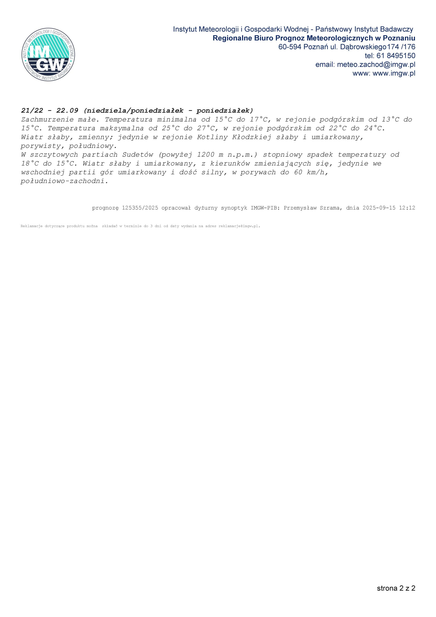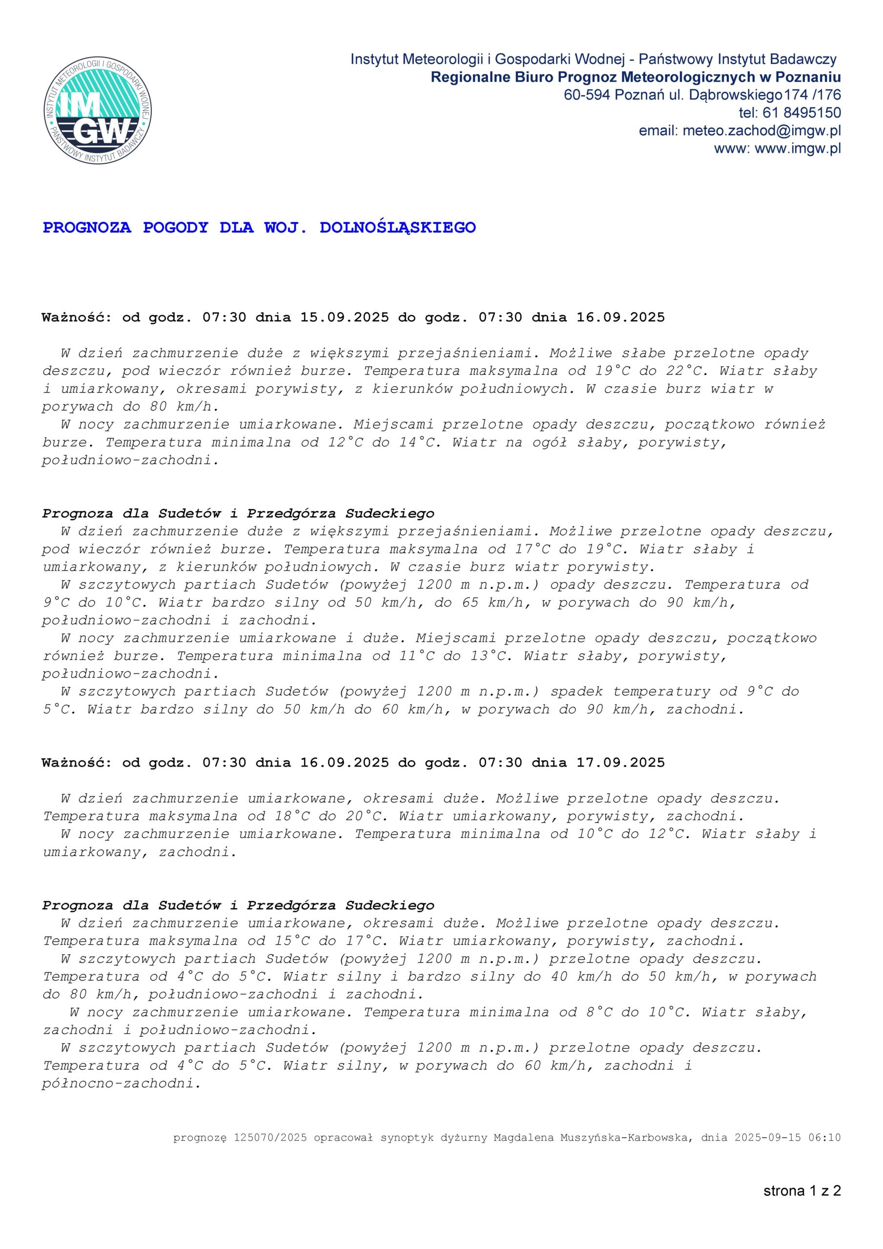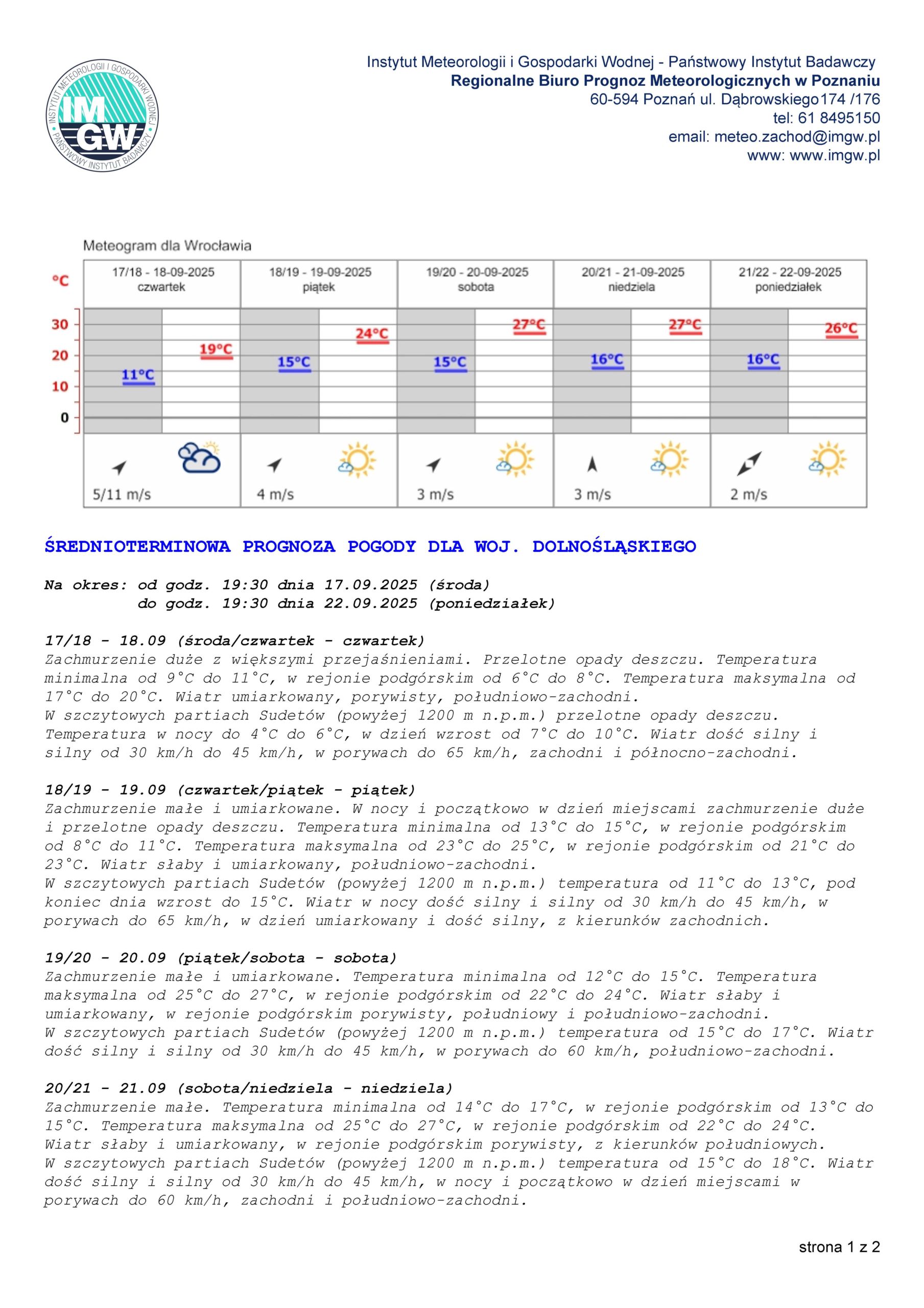 Średnioterminowa prognoza pogody dla woj. dolnośląskiego PROGNOZA POGODY DLA WOJ. DOLNOŚLĄSKIEGO Mariusz Gawlik2025-09-15T20:01:28+02:0015 września 2025|Aktualności, Komunikaty hydrologiczne, Ostrzeżenia meteorologiczne| Udostępnij FacebookXLinkedInWhatsAppEmail