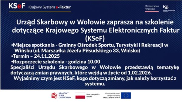Szkolenie dotyczące Krajowego Systemu Elektronicznych Faktur Urząd Skarbowy w Wołowie zaprasza na szkolenie dotyczące Krajowego Systemu Elektronicznych Faktur (KSeF) Mariusz Gawlik2025-11-19T08:40:11+01:0019 listopada 2025|Aktualności| Udostępnij FacebookXLinkedInWhatsAppEmail