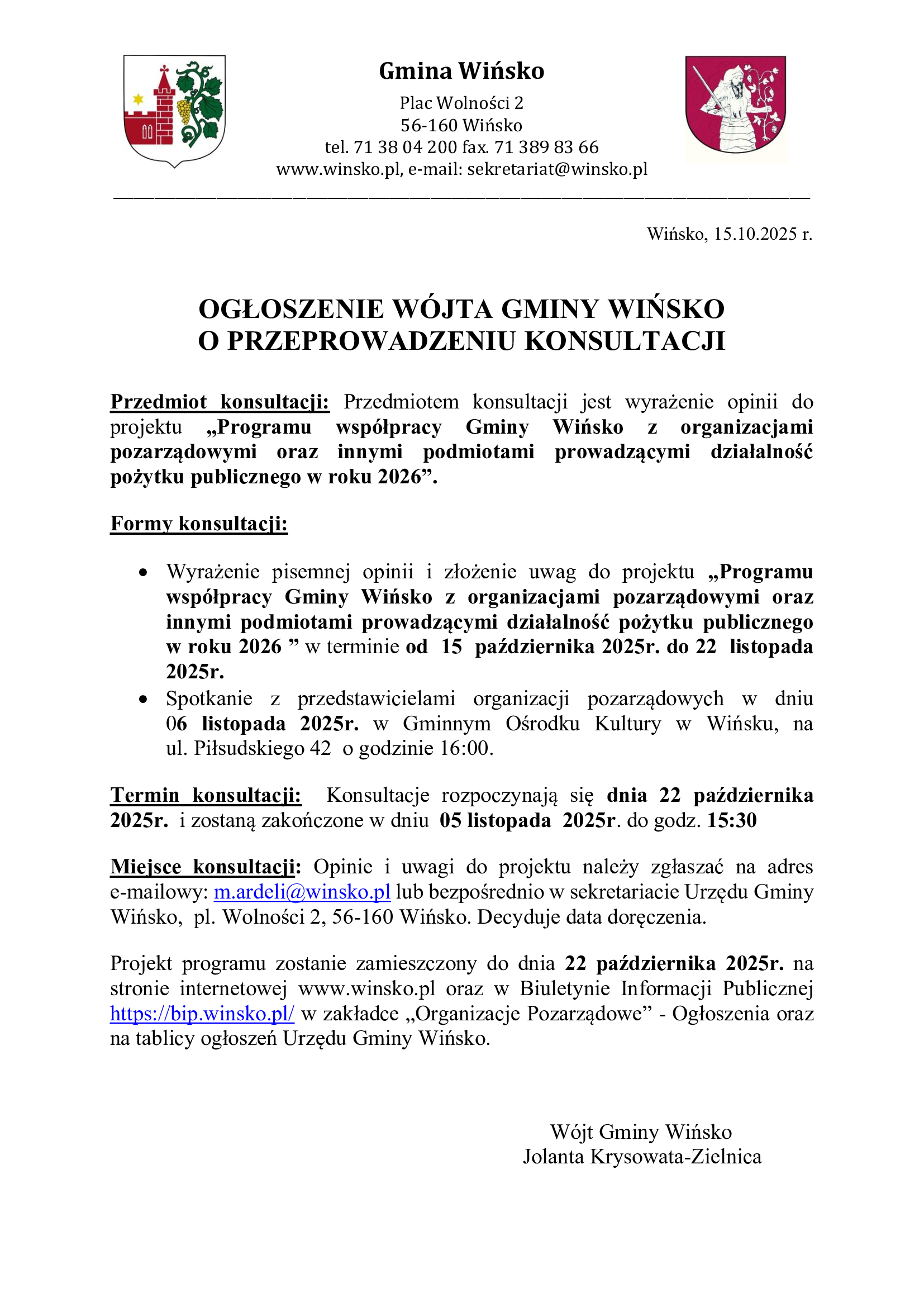 Wójt Gminy Wińsko ogłasza konsultacje w sprawie opinii do projektu „Programu współpracy Gminy Wińsko z organizacjami pozarządowymi oraz innymi podmiotami prowadzącymi działalność pożytku publicznego w roku 2026”