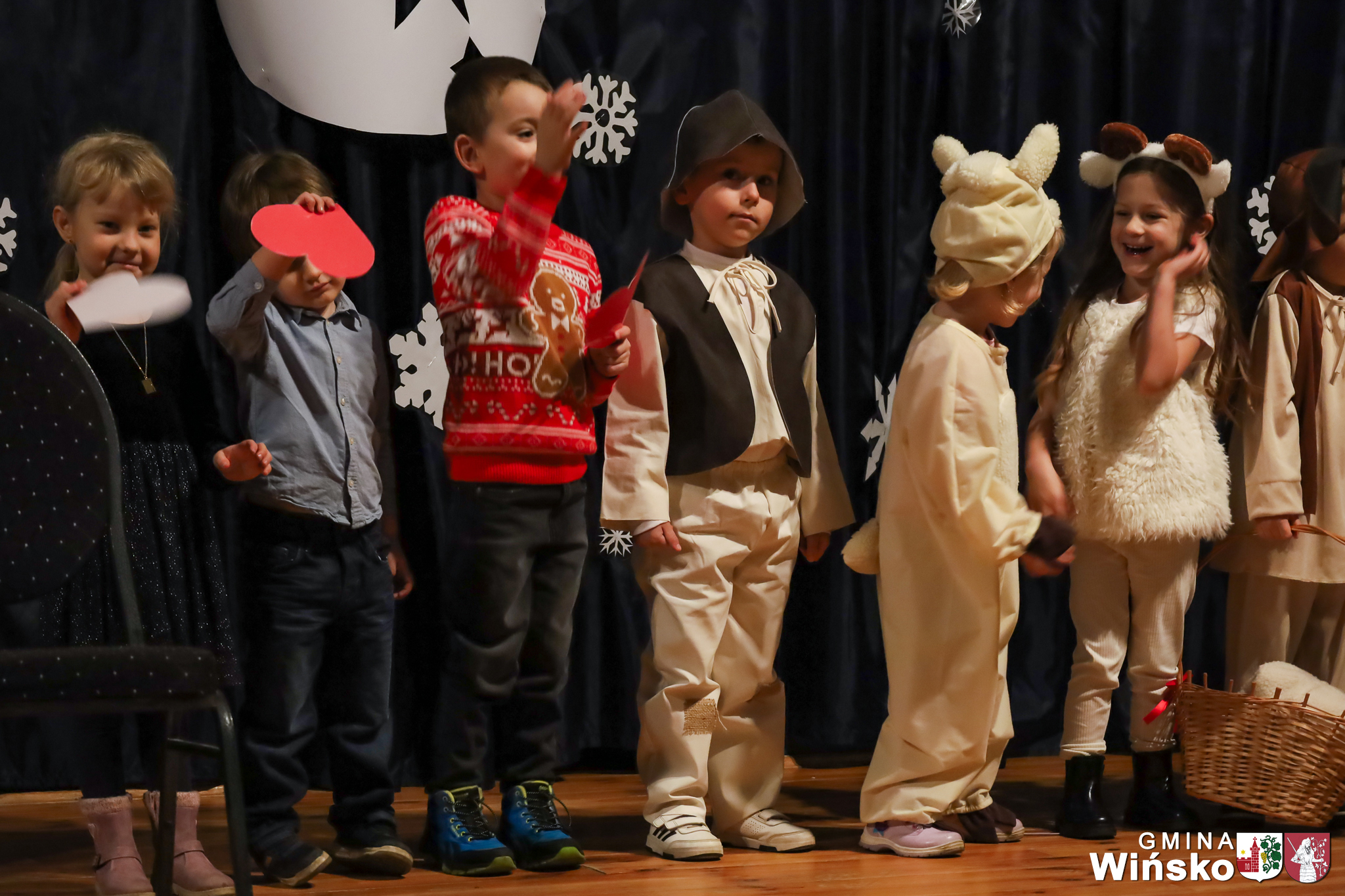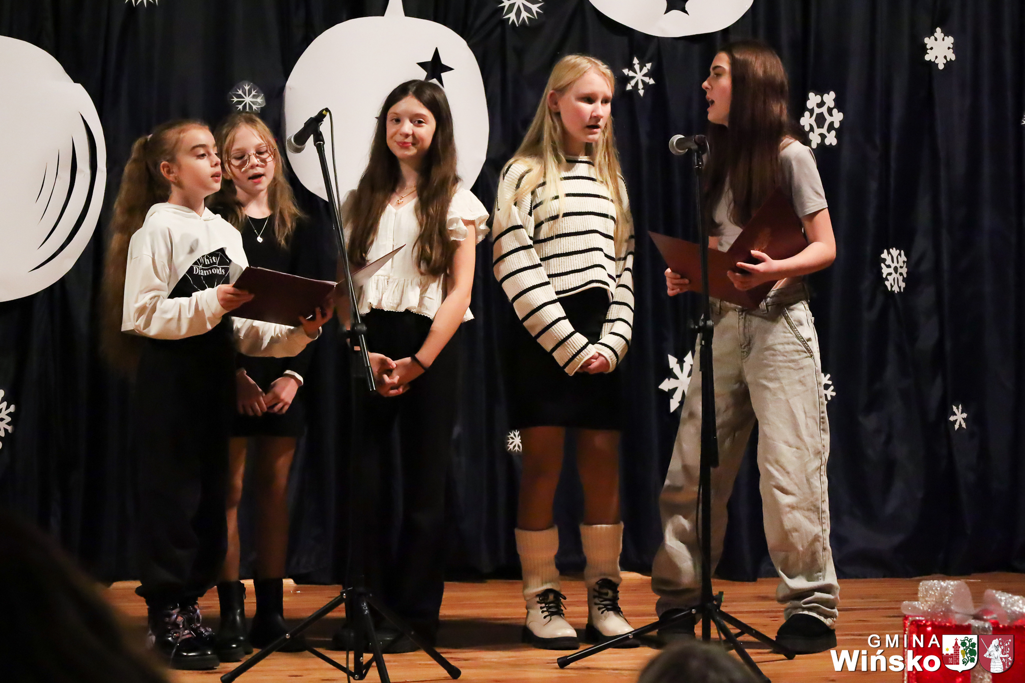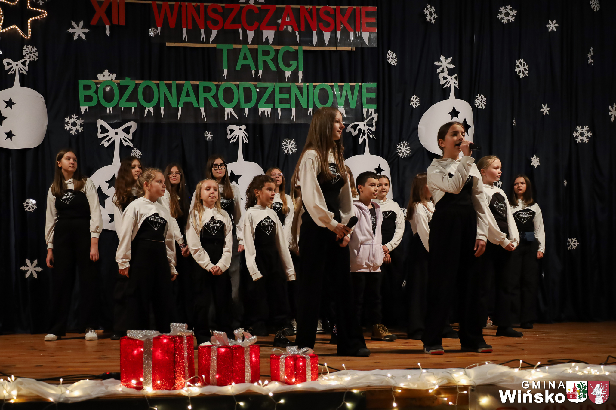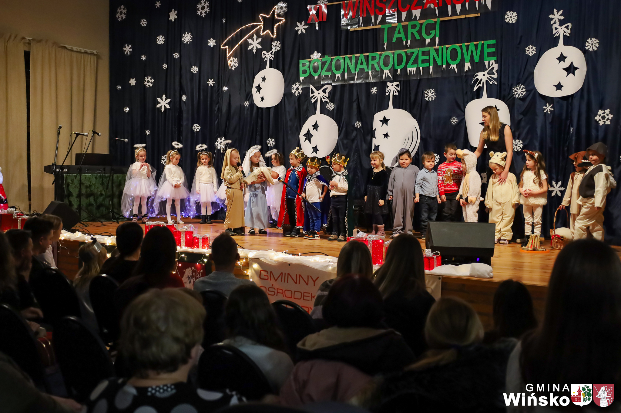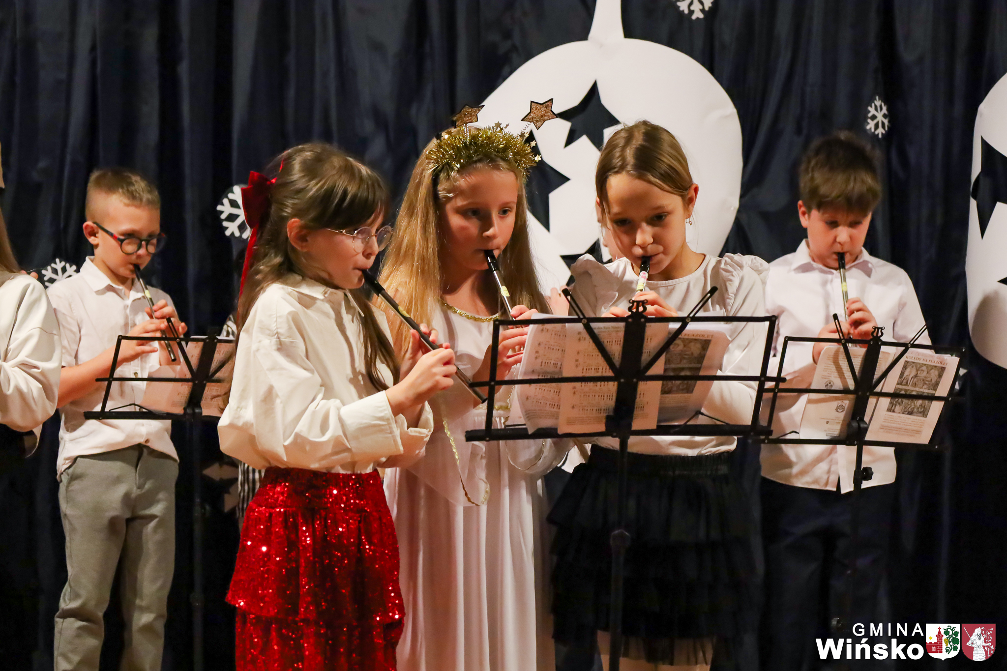 Na scenie wystąpił zespół Harfa, prezentując piękny świąteczny repertuar. Swoje umiejętności zaprezentowali również uczniowie szkół z terenu Gminy Wińsko, a także dzieci z Przedszkola Samorządowego w Wińsku, które oczarowały publiczność jasełkami, kolędami i tańcem. Nie zabrakło także energetycznych występów grup działających przy GOK: Black Fire, White Diamonds oraz Pink Dragons.