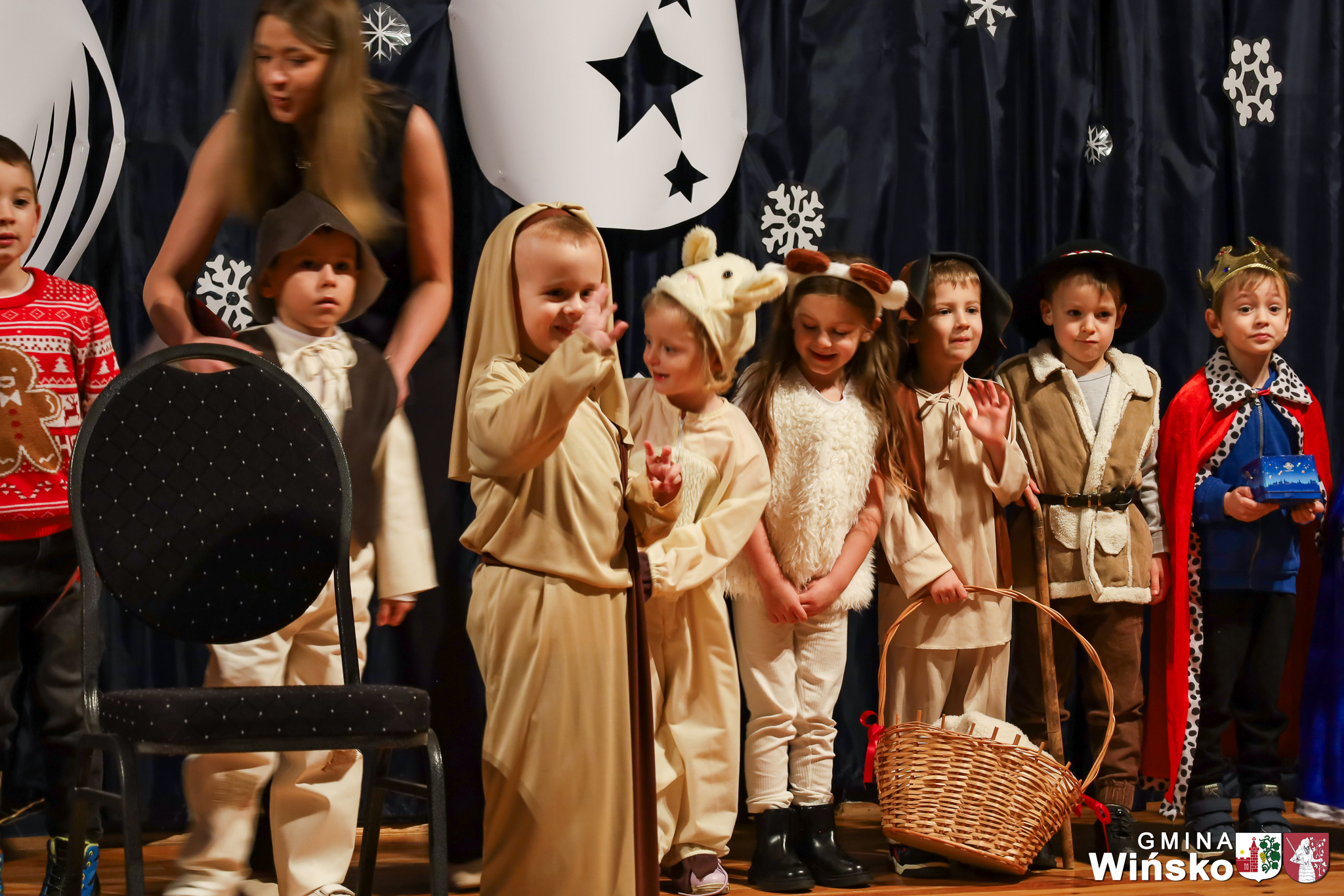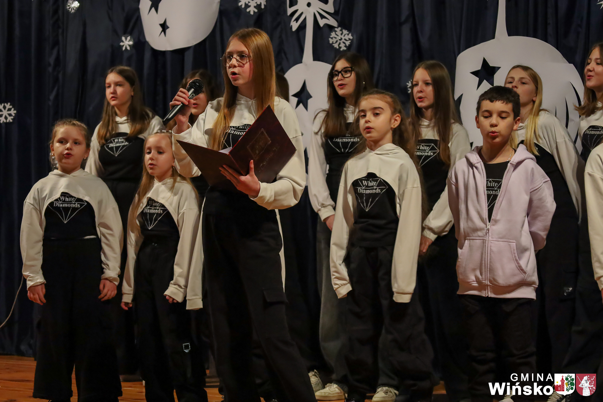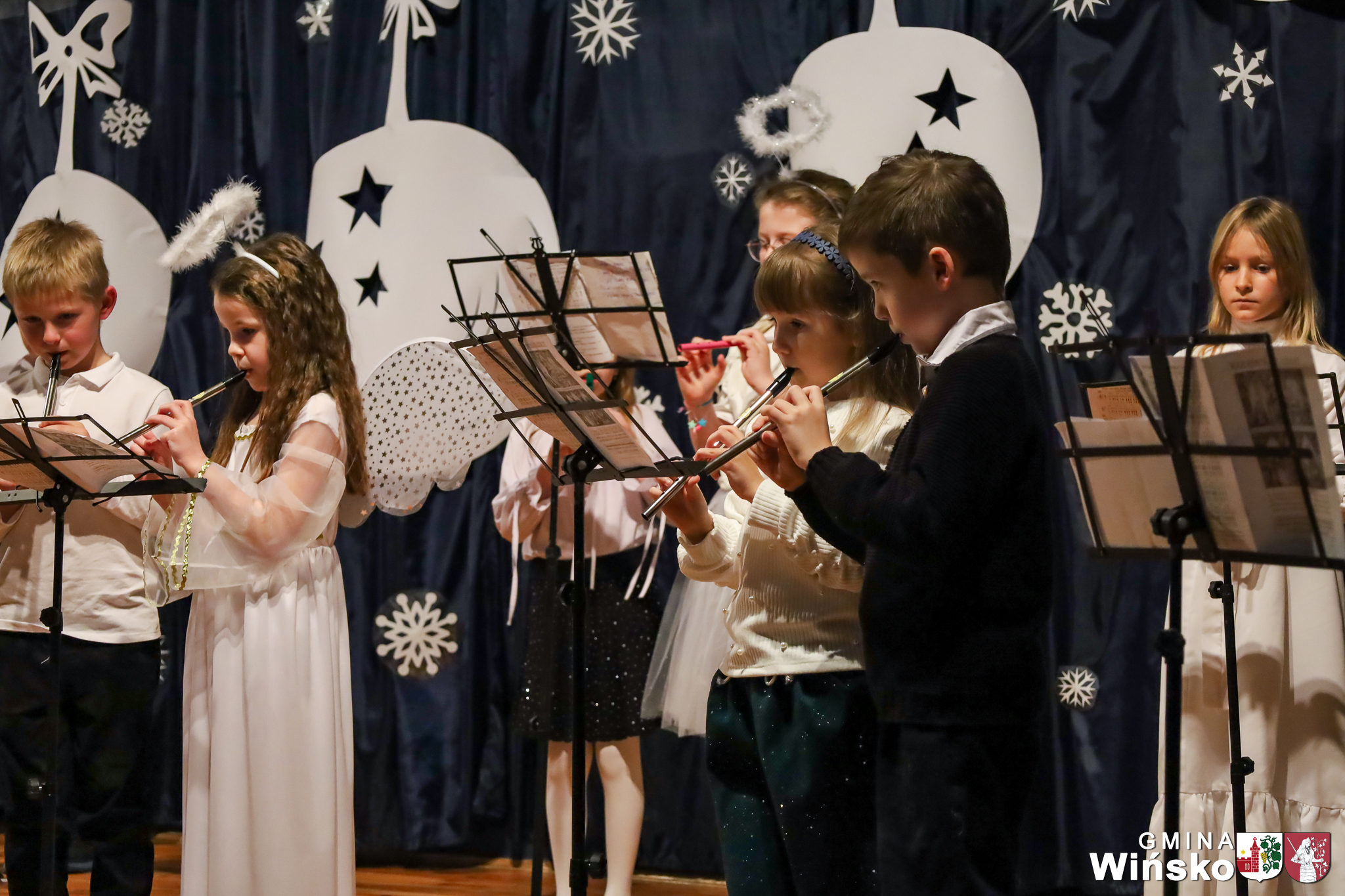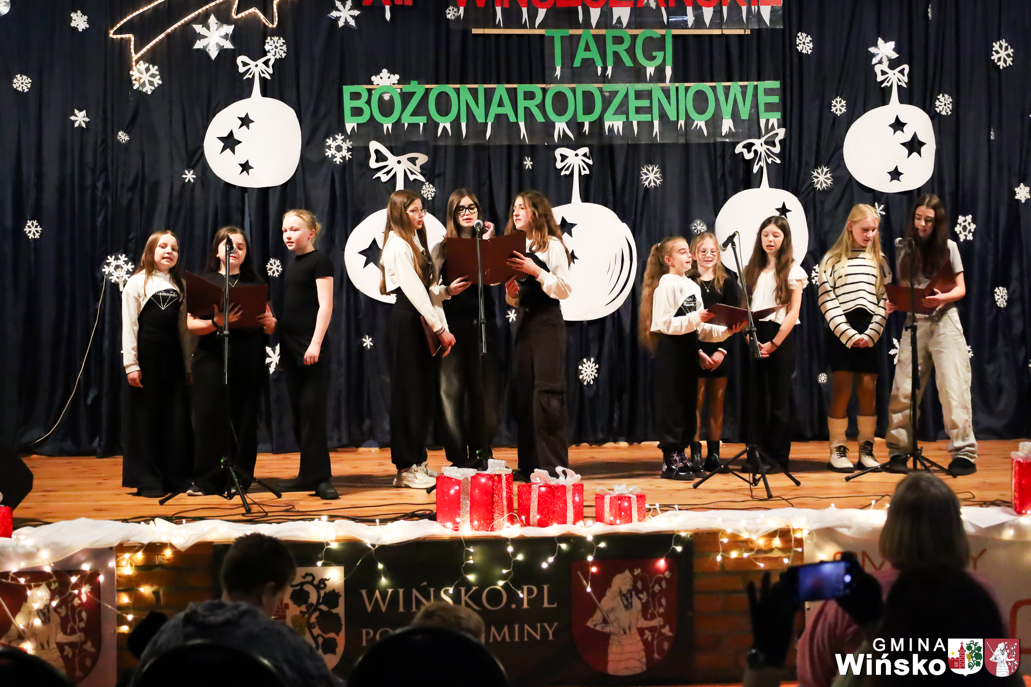 Na scenie wystąpił zespół Harfa, prezentując piękny świąteczny repertuar. Swoje umiejętności zaprezentowali również uczniowie szkół z terenu Gminy Wińsko, a także dzieci z Przedszkola Samorządowego w Wińsku, które oczarowały publiczność jasełkami, kolędami i tańcem. Nie zabrakło także energetycznych występów grup działających przy GOK: Black Fire, White Diamonds oraz Pink Dragons.